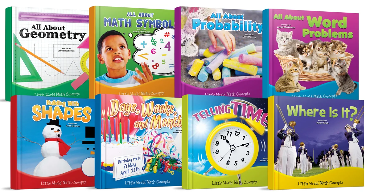 These covers were designed for an ongoing series and had to keep the some of the same look to be cohesive to the series. They are books for younger readers and teach basic math skills, such as place value, geometry, symbols, and time.