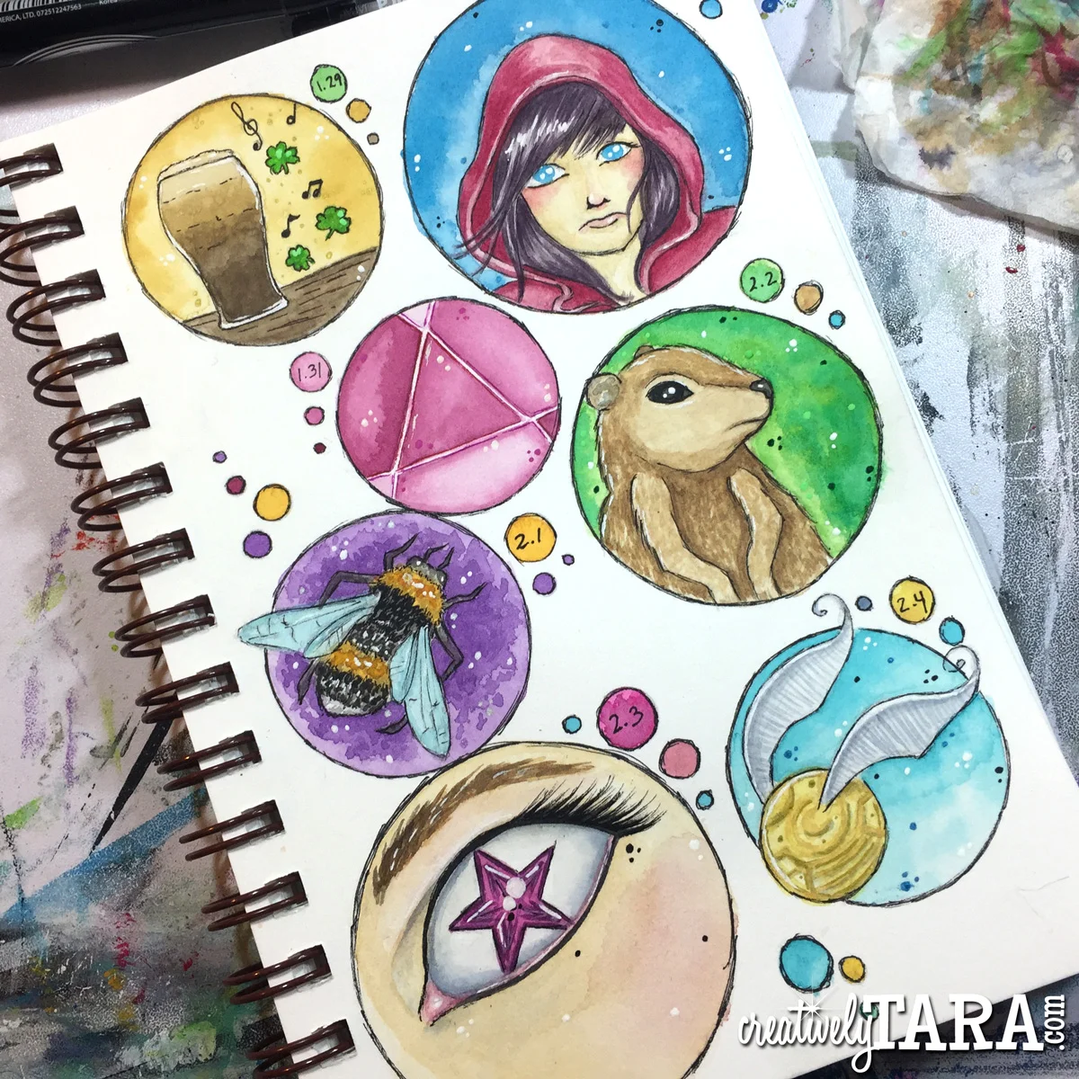 I kept up with my daily drawings up until right at the end of February. Here are some of the full pages I was able to complete. The size of this sketch book is 5.5x8 inches, to give you a little reference on the size of each of the mini paintings.